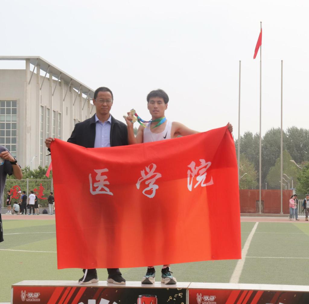 比赛现场精彩纷呈,医学院运动健儿们的表现更是让人激情澎湃,临床医学2022级13班尹文宜同学分别在男子5000米和10000米项目中夺得冠军,成为学院第一个“双冠王”,医学院党委书记孟琪为其颁奖。