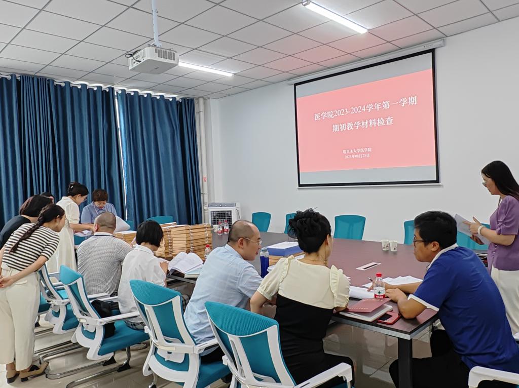 为保证2023-2024学年度第一学期教学秩序的正常运行,8月25日医学院在医科楼A206开展“学期初教学材料检查”,我院分管教学副院长顾继岩,教务办公室主任朱金焕及各课程组组长、副组长参加。