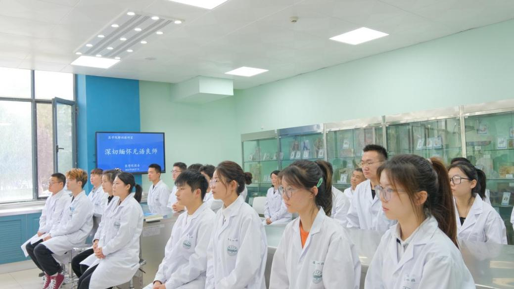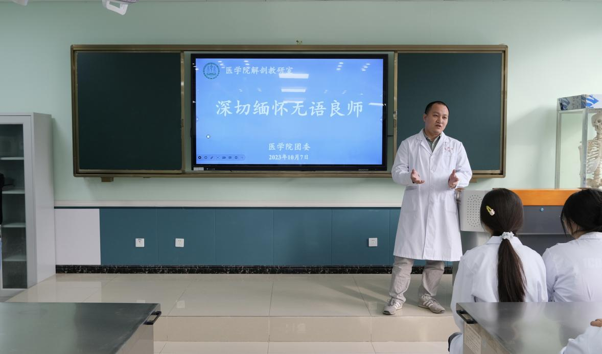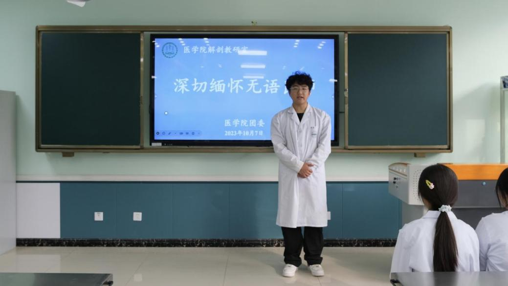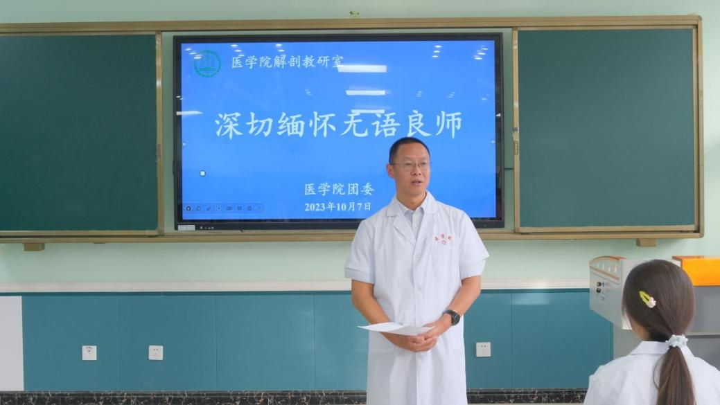 10月7日下午,塔里木大学医学院在医科楼B109举行“深切缅怀无语良师”仪式。学校党委常委、副校长石长青,教务处处长弋晓康,学院党委副书记、院长王琳琳,副院长顾继岩,学办主任万明辉,解剖教研室全体老师,全体辅导员和临床医学21级1班全体学生参加缅怀仪式,缅怀仪式由医学院党委书记孟琪主持。