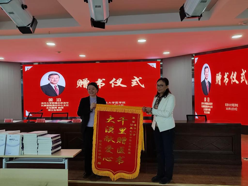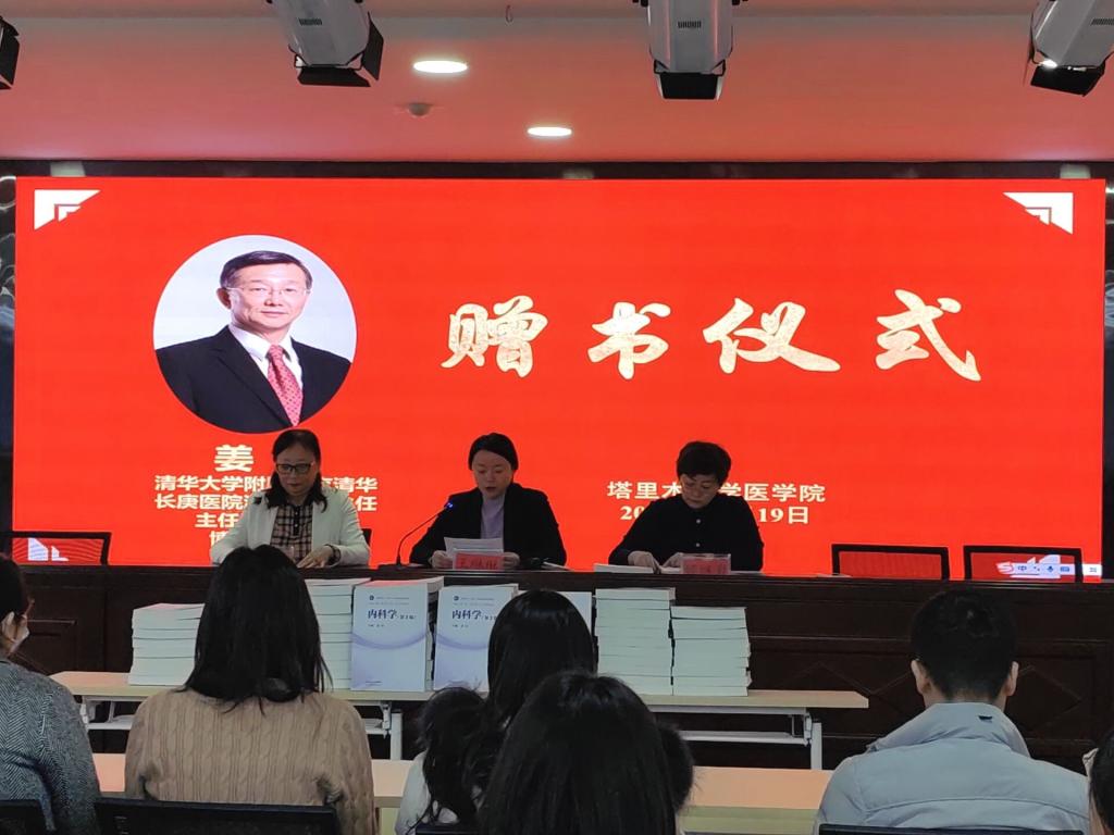 仪式最后,王琳琳院长代表塔里木大学医学院向姜泊教授献锦旗,崔教授为教师们发放书籍。此次书籍捐赠不仅丰富了学院的书籍类型,更寄托了姜泊教授对祖国西部医学教育事业的深切关心。
