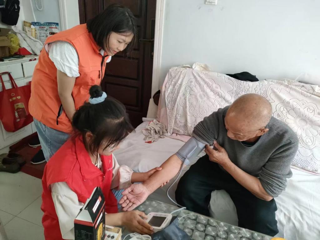 活动中,“医路同行”志愿者对老人进行了血压测量,并叮嘱老人多锻炼,每天保持心情顺畅。