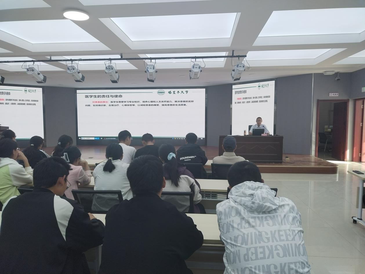 塔里木大学党委常委、副校长谢建新教授以“医道人生”为题,从国际医学教育改革趋势与国内基层医疗人才需求切入,为新生分析医学专业发展前景,拓宽行业视野,坚定从医信心;医学院党委书记孟琪以“医起筑梦”为题,结合兵团医疗战线前辈扎根边疆、守护百姓健康的鲜活案例,深入阐释胡杨精神的时代内涵,引导新生将个人理想融入边疆医疗卫生事业发展。