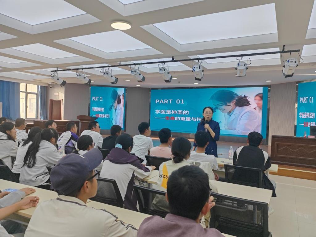 银龄教师代表、吉林大学崔丽教授以“医者仁心”为主题,用四年里援疆支教的亲身经历,生动诠释“医道即人道”的职业真谛,帮助新生筑牢“服务边疆、守护健康”的职业信仰。医学院党委副书记、纪委书记余明星通过“我的大学我做主”,以互动交流方式,详细讲述了五年制的学分要求、技能证书、学业就业等关键点,结合优秀学长案例,指导新生制定贴合自身实际的个性化成长计划,为更好适应大学生活提供有效指导。