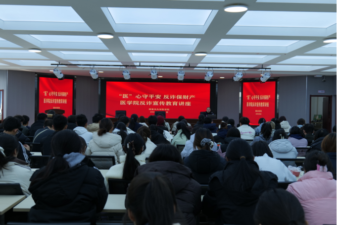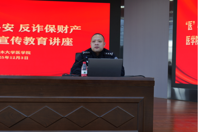 12月3日下午,医学院联合塔里木大学派出所举办“‘医’心守平安 反诈保财产”反诈宣传专题讲座。面向2025级医学生开展宣传教育。