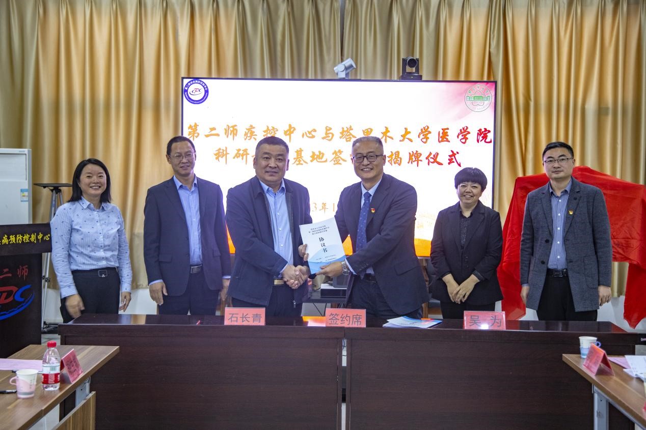 塔里木大学党委常委、副校长石长青,第二师疾病预防控制中心副主任吴为共同签订了《塔里木大学医学院第二师疾病预防控制中心建立科研教学基地协议书》。